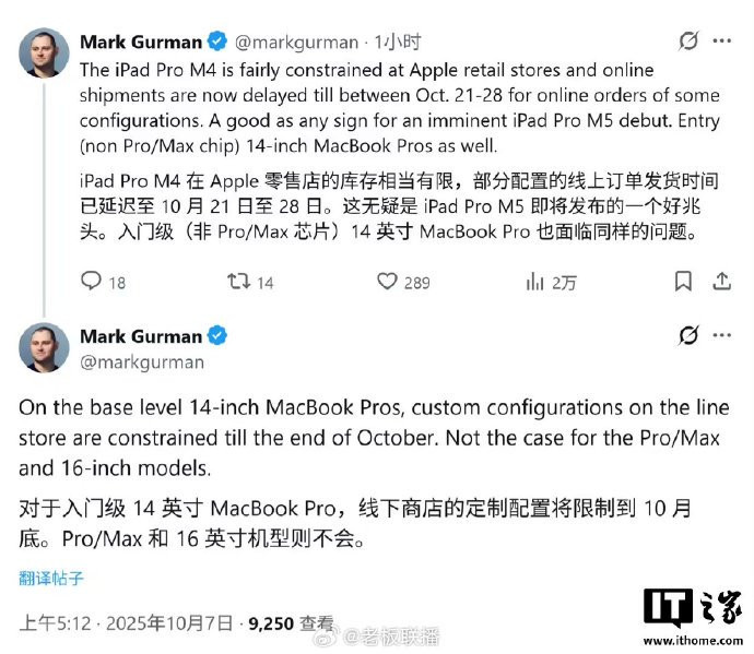 [#苹果本月末或发布新iPad和Mac#]#曝新款iPad和Mac要来了#10月7日,彭博社的马克・古尔曼(MarkGurman)在X平台发布推文,观察发现苹果官网多款产品的库存正持续减少,这通常是硬件更新的前兆,预计苹果将在本月晚些时候发布新款iPad和Mac电脑。 具体来看,M4iPadPro的缺货情况尤为明显。消费者在苹果美国官网选购时会发现,根据配置不同,部分型号的预计交付时间最长已达到三周。与此同时,M4MacBookPro产品线也出现了类似迹象,虽然Pro/Max和16英寸型号供应充足,但基础款14英寸型号的定制配置订单已积压,发货时间被推迟至十月底。 然而,并非所有产品都受到影响。此前有报道称将获得小幅规格提升的AppleVisionPro,其目前的库存状态基本保持稳定,未出现供应紧张,可能意味着其更新优先级较低或已完成备货。至于新品的发布形式,苹果近年来交替采用举办线下发布会和直接线上发布新闻稿的方式,目前尚无确切消息表明此次将采用何种形式。